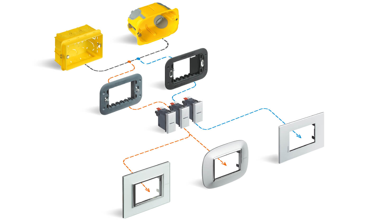 Axolute si installa nelle normali scatole da incasso e da parete mediante i supporti.