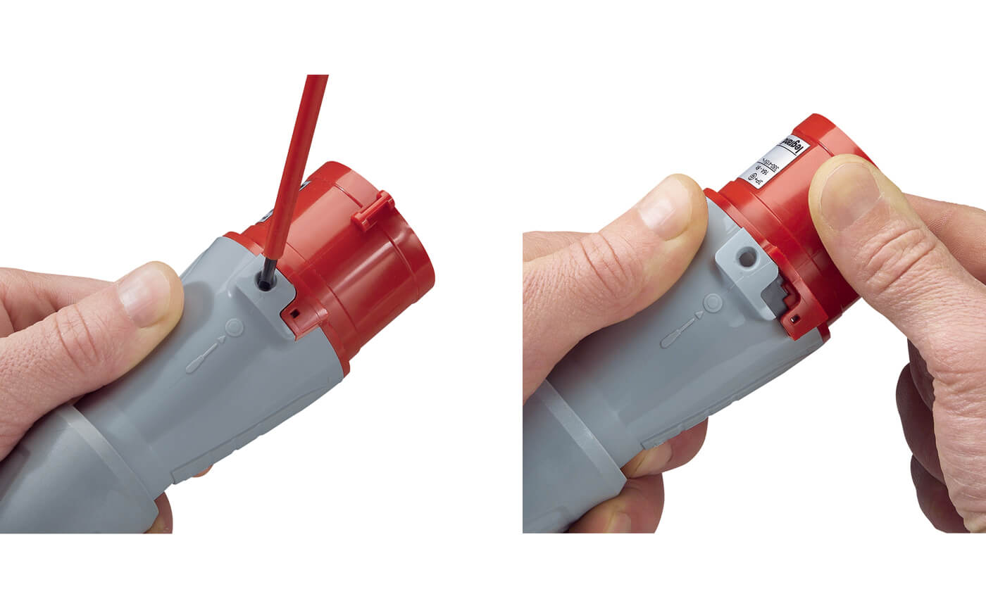 Le prese e spine sono predisposte per lo bloccaggio rapido mediante cacciavite. Un’apposita marcatura indica la posizione per la clip di chiusura. L’apertura si realizza semplicemente ruotando le 2 parti in direzioni opposte.