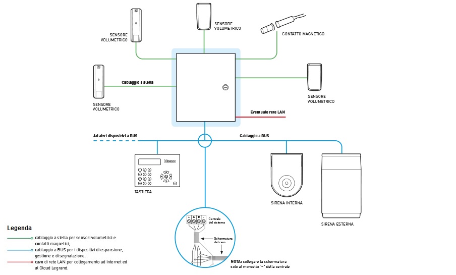 L’installazione di un impianto Antifurto con tutte le possibilità di integrazione si effettua predisponendo 3 differenti cablaggi: