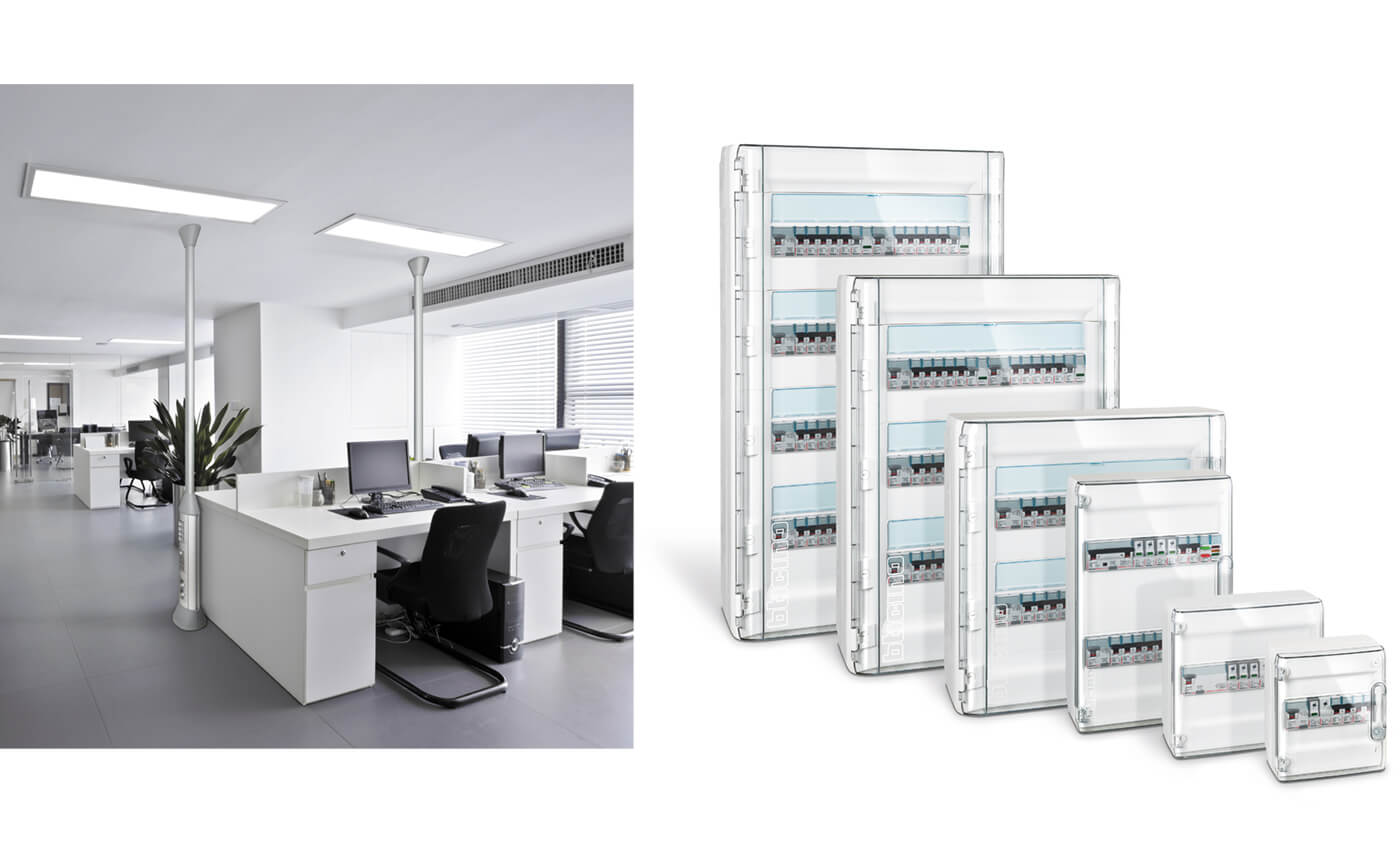 Per le applicazioni del terziario sono disponibili centralini da incasso e parete in lamiera con grado di protezione IP40. Le calotte in plastica completano l'offerta di contenitori per apparecchi modulari.