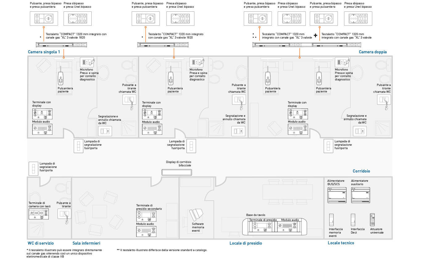 - Segnalazione acustica e visiva della chiamata infermiere nei locali di presidio con le indicazioni di camera, letto e bagno;