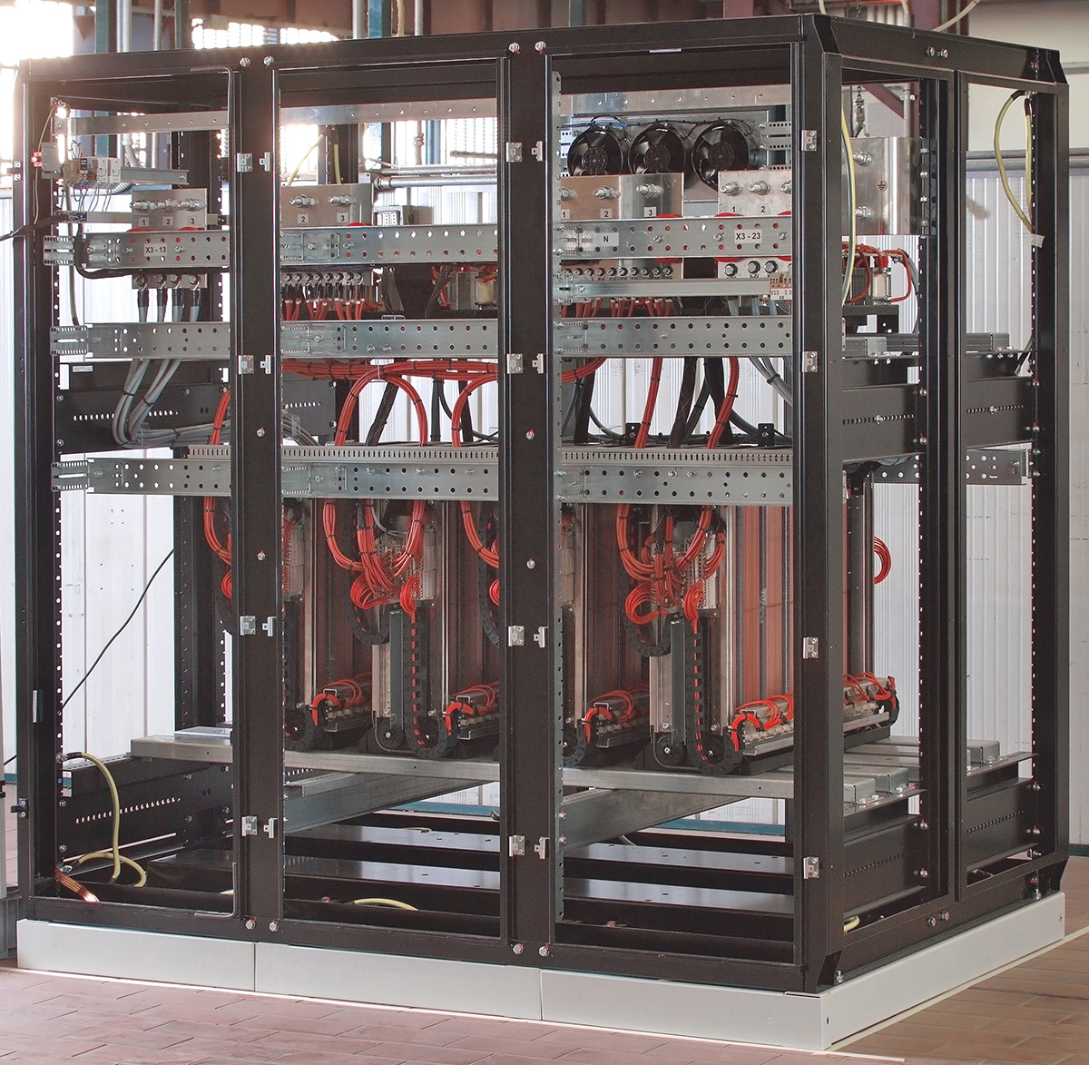 In particolare, ognuno dei due quadri elettrici forniti da BTicino prende alimentazione dalla rete e la trasferisce al carico attraverso il ramo stabilizzato (stabilizzatore + trasformatore) e i relativi interruttori di protezione (In=6.300 A in ingresso e In=5.000 A in uscita) o tramite l’interruttore di by-pass (In=6.300 A). Tramite opportune manovre, e grazie agli interblocchi tra gli interruttori, il ramo stabilizzato può essere posto fuori tensione per poter eseguire opere di manutenzione sullo stabilizzatore e sul trasformatore in completa sicurezza. In questo caso il carico continua ad essere alimentato direttamente dalla rete, anche se senza le qualità dell’energia garantite dallo stesso ramo stabilizzato.